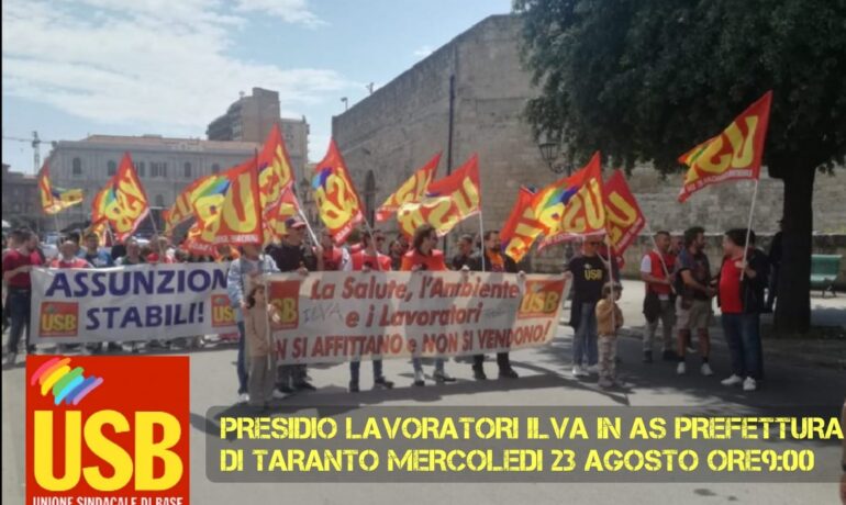 L’Usb, Unione Sindacale di Base di Taranto, ha annunciato un presidio in Prefettura mercoledì 23 agosto dalle 9.00 alle 12.00. Il sindacato chiede di incontrare il Prefetto Demetrio Martino, per consegnargli un documento contenente una serie di proposte che l’Usb intende fare…