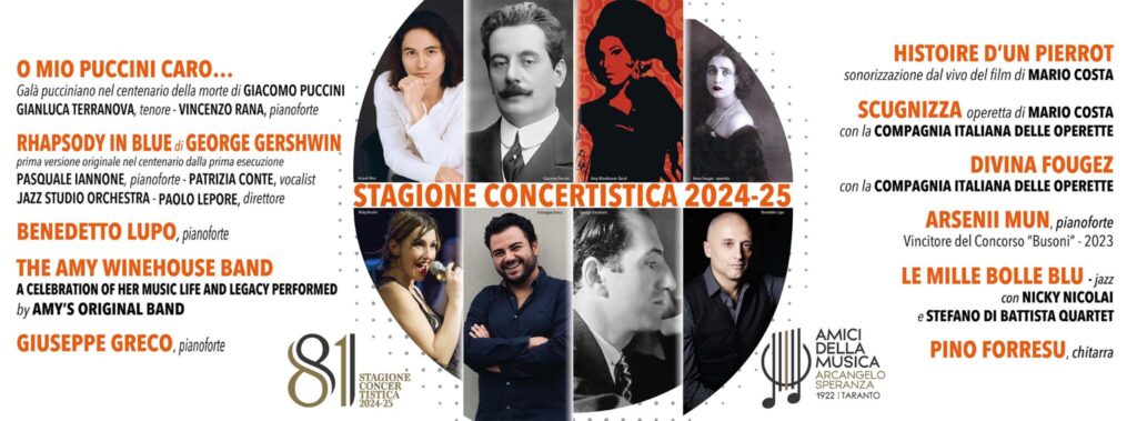 L’ottantunesima stagione concertistica degli amici della musica Arcangelo speranza è una stagione concertistica 2024 ricca di omaggi, come quello dedicato ai 100 anni dalla prima esecuzione in pubblico di Rapsodia in Blu di Gershwin, proposta dalla Jazz Studio Orchestra diretta da Paolo Lepore eseguita nella prima versione originale, con Pasquale Iannone al pianoforte.